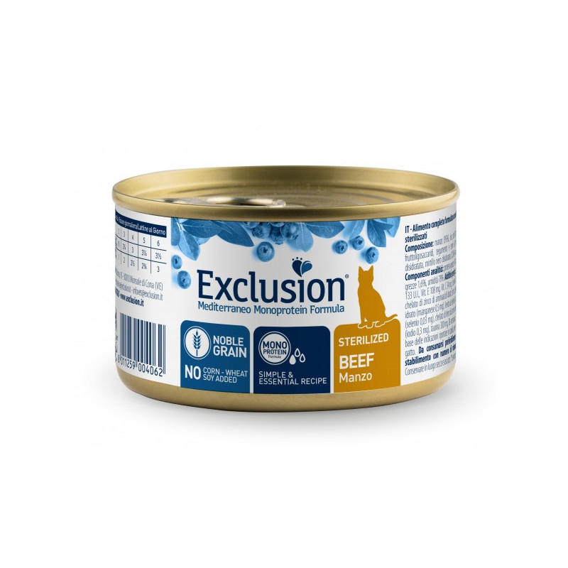 Exclusion Mediterraneo Monoprotein Formula – повнораціонний збалансований корм на основі висоякісного зерна та дегідрованого монопротеїну тваринного походження. Спеціально розроблена формула містить тільки натуральні антиоксиданти та забезпечує здоров’я сечовидільної системи. Корм створений в кращих середземноморських традиціях та включає в себе гранат, ожину, малину та чорницю. Рецептура збагачена псиліумом, який перешкоджає утворенню грудочок шерсті у травному тракті.