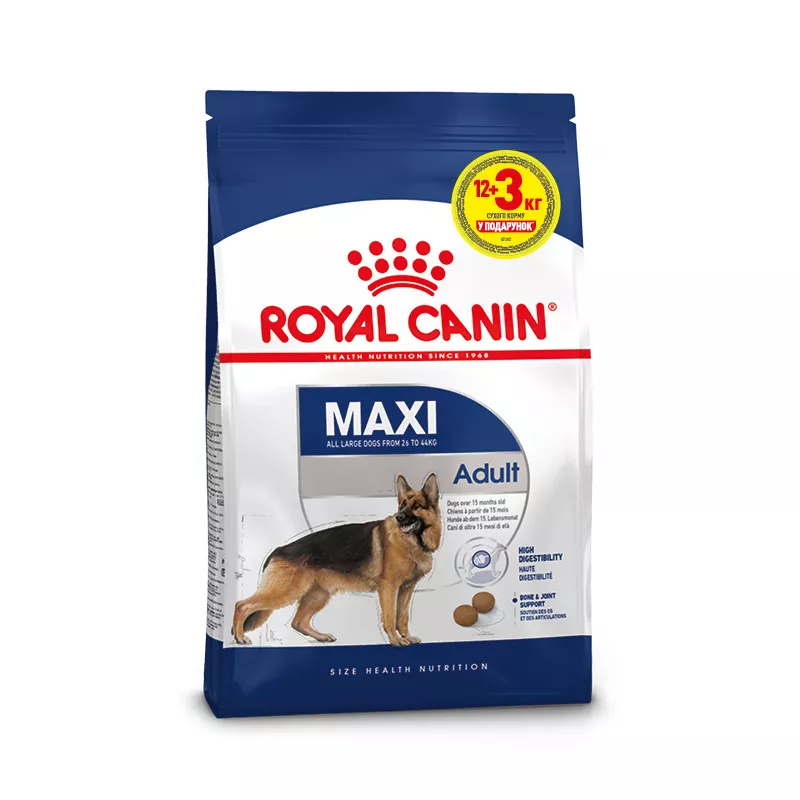 Так, сухий корм Royal Canin Maxi Adult призначений для собак великих порід з вагою від 26 до 44 кг у дорослому віці.