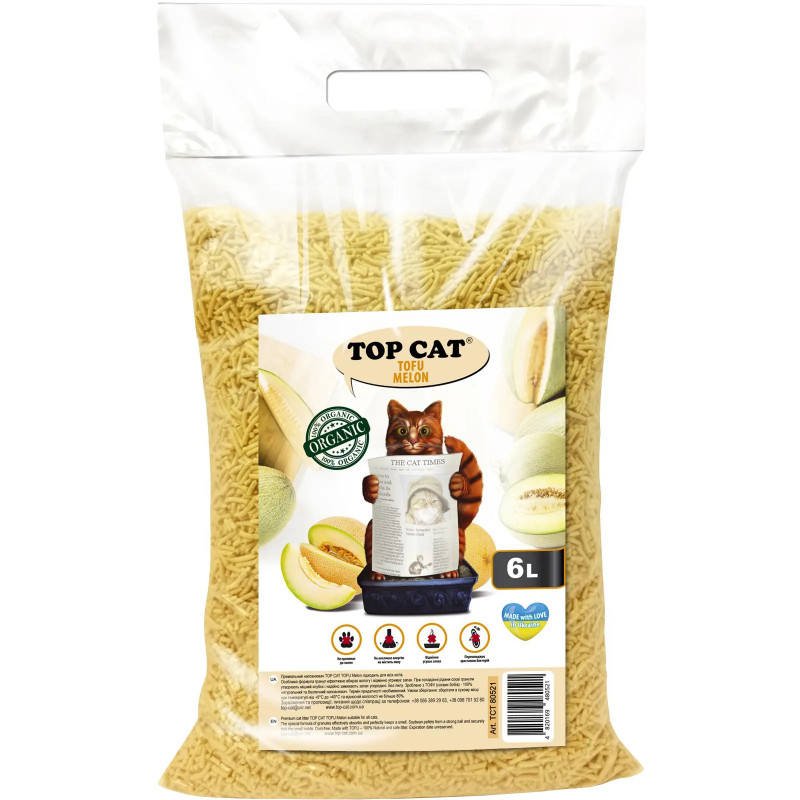 Наповнювач для котячого туалету Top Cat Tofu Диня соєвий - це натуральний наповнювач, що комкується, виготовлений з соєвих волокон.