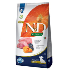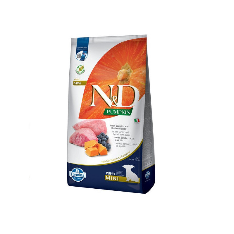 N&D GRAIN FREE PUMPKIN DOG LAMB & BLUEBERRY PUPPY MINI 7 kgБеззерновий сухий корм для цуценят дрібних порід (гарбуз / ягня / чорниця), 7 кгN & D Grain Free Pumpkin Puppy Mini Lamb and Blueberry - це повноцінний сухий корм для цуценят, вагітних і годуючих сук.