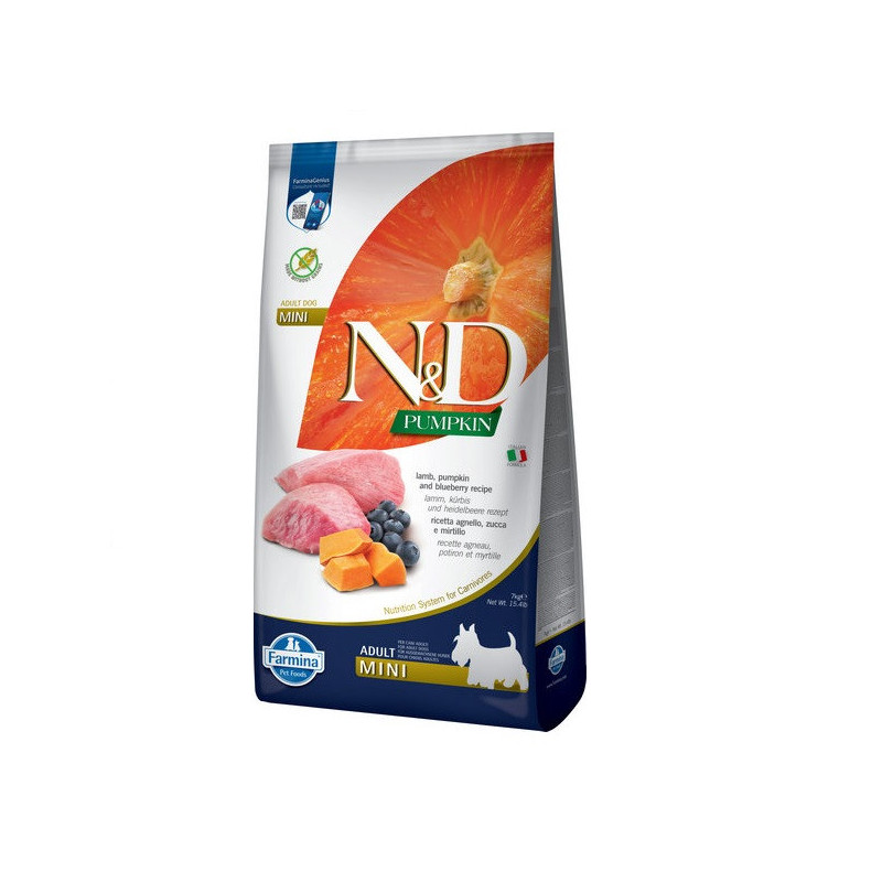 N&D GRAIN FREE PUMPKIN DOG LAMB & BLUEBERRY ADULT MINI 7 kgБеззерновий сухий корм для собак дрібних порід (гарбуз / ягня / чорниця), 7 кгЕксклюзивна формула Farmina N & D Grain Free Pumpkin Adult Mini Lamb and Blueberry, що складається тільки з м'яса і без додавання злаків, замінена овочами і свіжими фруктами, забезпечує тварину необхідними поживними речовинами, сприяючи його самопочуттю і здоров'ю.Завдяки таким інгредієнтам, як свіжа баранина і чорниця, які є джерелом натуральних волокон і антиоксидантів, ці крокети надають тварині необхідну енергію.