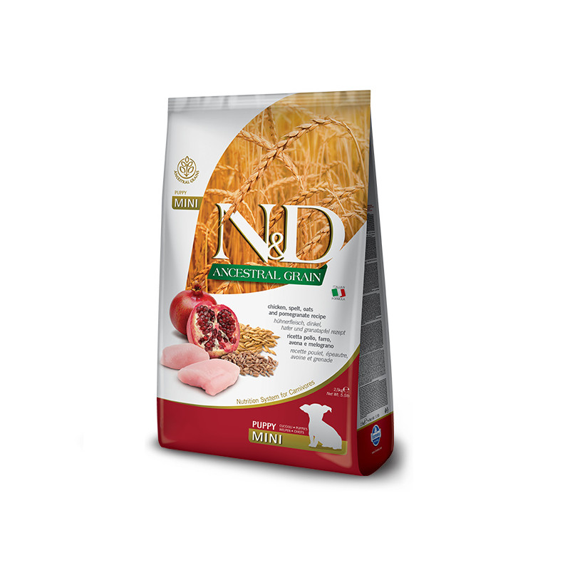 N&D LOW GRAIN DOG CHICKEN & POMEGRANATE PUPPY MINI 2,5 kgНизькозерновий сухий корм для цуценят дрібних порід (курка / гранат), 2.5 кгFarmina N & D Low Grain Puppy Mini Chicken and Pomegranate - це повноцінний корм для цуценят і сук, які вагітні або годують грудьми.