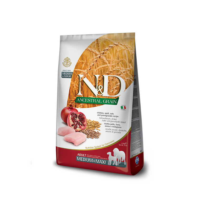 N&D LOW GRAIN DOG CHICKEN & POMEGRANATE ADULT MEDIUM & MAXI 2,5 KGНизькозерновий сухий корм для собак середніх та великих порід (курка / гранат), 2,5 кгFarmina N & D Low Grain CHICKEN & POMEGRANATE Adult MEDIUM & MAXI - це повноцінний сухий корм для собак середніх та великих порід.