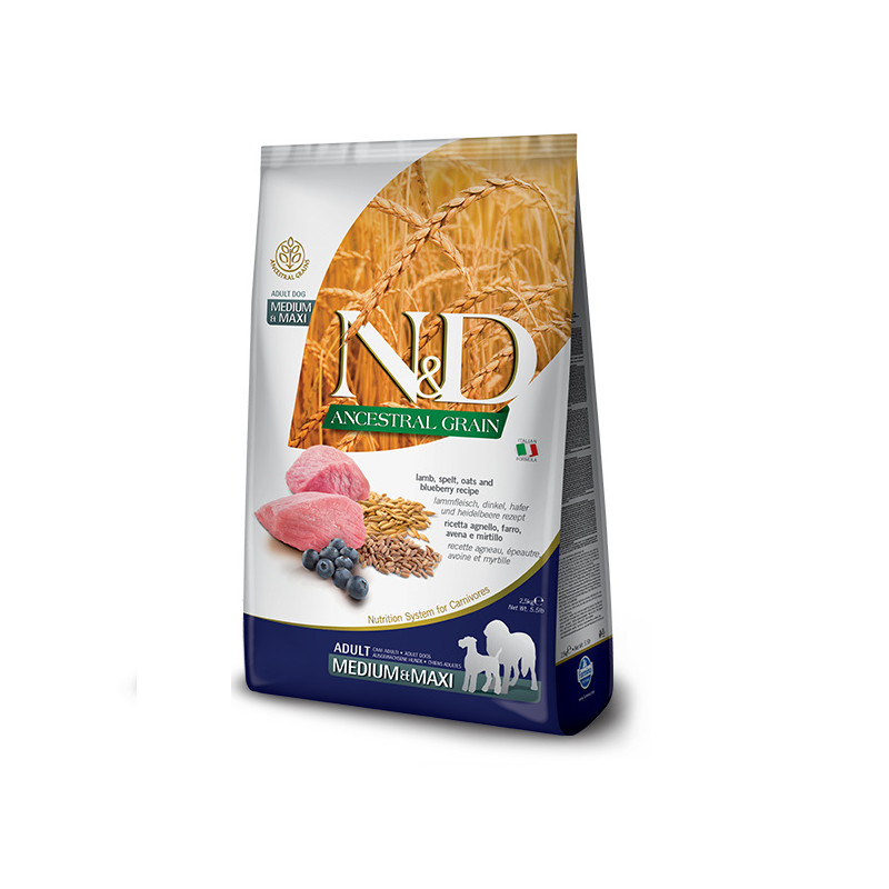 N&D LOW GRAIN DOG LAMB & BLUEBERRY ADULT MEDIUM & MAXI 2,5 KGНизькозерновий сухий корм для собак середніх та великих порід (ягня / чорниця), 2,5 кгFarmina N & D Ancestral Grain ADULT MEDIUM & MAXI Lamb and Blueberry для дорослих собак середніх і великих порід, багатий тваринним білком, фруктами, овочами, мінералами і невеликою кількістю спадкових злаків.