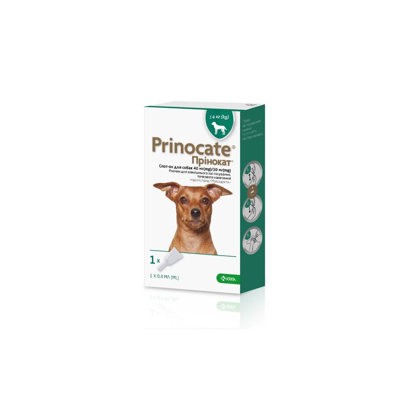 Прінокат® Спот-он для собак(розчин для зовнішнього застосування, точкового нанесення)ОписПрозорий, жовтуватий, жовтий або коричнево-жовтий розчин.Склад1 мл розчину містить діючі речовини:імідаклоприд – 100 мг,моксидектин – 25 мг.Допоміжні речовини: спирт бензиловий, пропіленкарбонат, бутилгідрокситолуол (E 321), троламін.Фармакологічні властивості ATC vet класифікаційний код АТС vet: QP54, ендектокциди (QP54АВ52, моксидектин; QP53AX17, імідаклоприд).Імідаклоприд, 1-(6-хлоро-3-піридилметил)-N-нітро-імідазолідин-2-іліденамін є ектопаразитицидом, що належить до класу нітрометилен-гетероциклічних сполук.