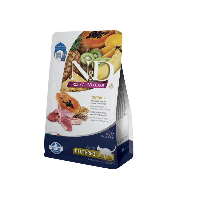 Тому що в лінійці представлено 5 тропічних фруктів, таких як Манго, Ківі, Ананас, Папайя та Банан у кожному рецепті.N&D CAT TROPICAL SELECTION LAMB NEUTERED це повнораціонний низькозерновий корм з ягням та тропічними фруктами, розроблений для потреб вашої стерилізованої кішки.
