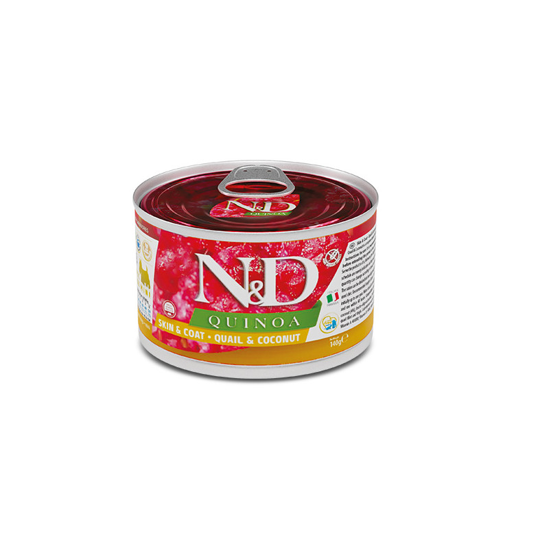Повнораціонний дієтичний корм для дорослих собак.N&D Quinoa Skin & Coat - Quail & Coconut - повнораціонний дієтичний корм для собак, рекомендований для зниження непереносимості інгредієнтів і поживних речовин.Склад: філе і ніжка перепела (55%), екстракти насіння кіноа (5%), риб'ячий жир, кокос (4%), фруктоолігосахариди, хондроїтину сульфат, глюкозамін, вітаміни, мінерали.
