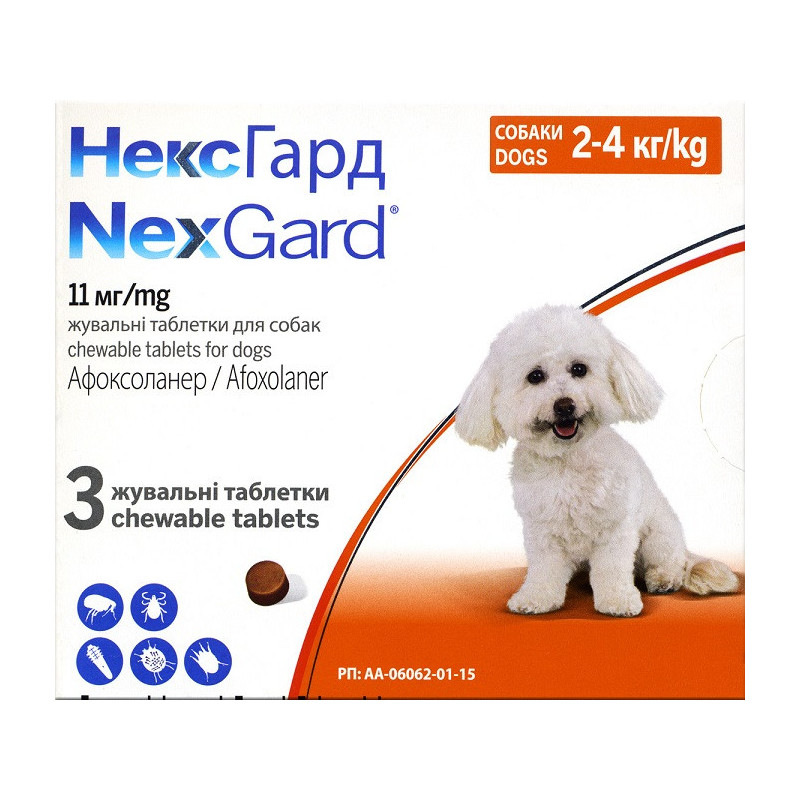 Boehringer Ingelheim НексГард - інсекто-акарицидний засіб у вигляді таблеток для жування, що застосовуються для профілактики та лікування собак масою тіла 2-4 кг при ураженнях ектопаразитами, а також для профілактики ураження кліщами. Призначення: Профілактика та лікування собак при ураженнях кліщами (Dermacentor variabilis, D. reticulatus, Ixodes ricinus, I. scapularis, I. hexagonus, Rhipicephalus sanguineus, Amblyomma americanum та Haemaphysalis longicornis) та блохами (Ctenocephalides felis та C. canis). Препарат можуть застосовувати, як один із засобів, при лікуванні блошиного алергічного дерматиту собак:o Лікування демодекозу (спричиненого Demodex canis).o Лікування саркоптозу (спричиненого Sarcoptes scabiei var. canis).o Лікування отодектозу (спричиненого Otodectes cynotis). Механізм дії:Афоксоланер належить до сполук ізоксазолінового класу, його дія полягає в блокуванні ГАМК-залежних рецепторів паразитів, порушенні передачі нервових імпульсів, що призводить до ураження нервової системи ектопаразитів і їх загибелі.