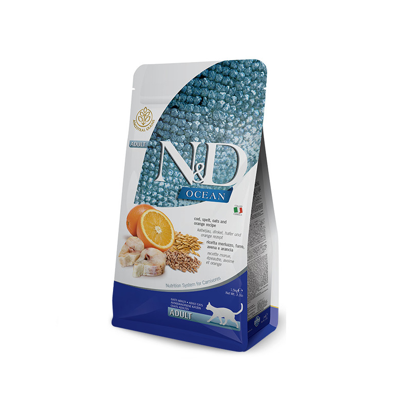 • Низькозерновий сухий корм Farmina N&D Ocean для дорослих котів, з тріскою та апельсином, 1,5 кг