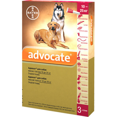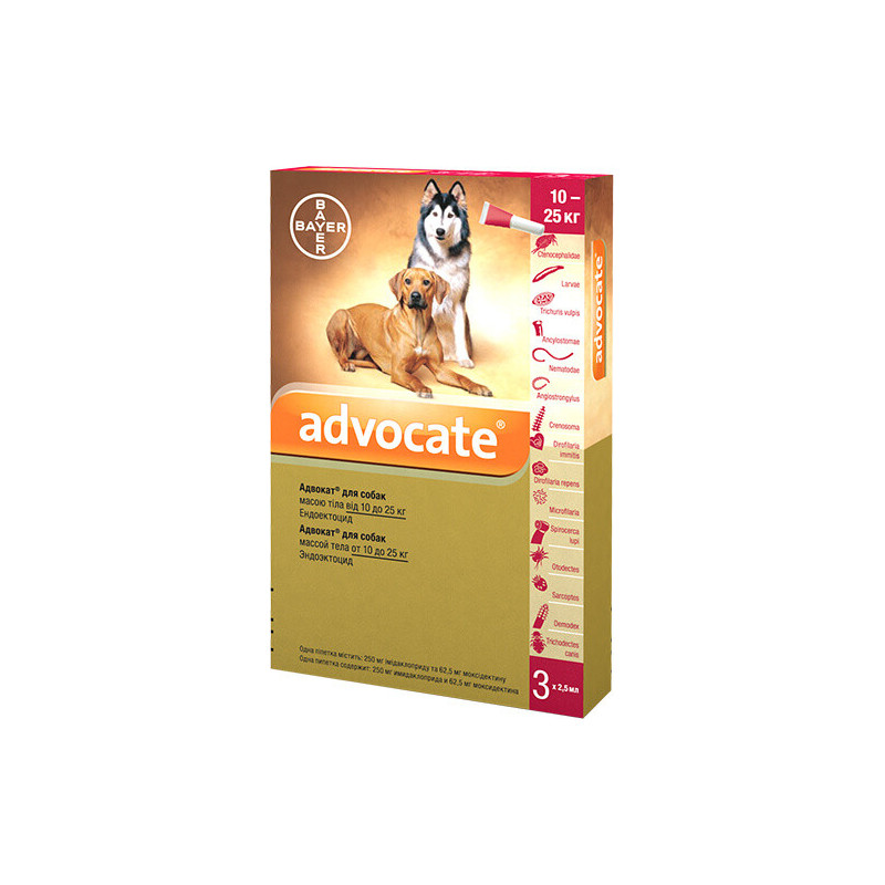 Краплі проти паразитів Байєр Адвокат Спот-он для собак 10-25 кгBayer (Байєр) Адвокат Спот-он Золотий стандарт контролю паразитів у собак. Склад: 10% імідаклоприду та 2,5% моксідектину. Показання до застосування: Собакам для лікування і профілактики змішаних паразитарних інвазій: - для лікування та попередження зараження блохами (Ctenocephalides felis), - лікування отодектоза (Otodectes cynotis)