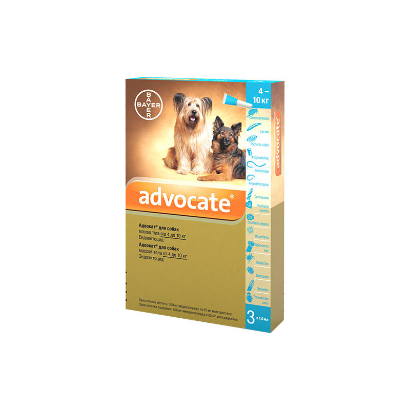 Краплі проти паразитів Байєр Адвокат Спот-он для собак 4-10 кгBayer (Байєр) Адвокат Спот-он Золотий стандарт контролю паразитів у собак. Склад: 10% імідаклоприду та 2,5% моксідектину. Показання до застосування: Собакам для лікування і профілактики змішаних паразитарних інвазій: - для лікування та попередження зараження блохами (Ctenocephalides felis), - лікування отодектоза (Otodectes cynotis),