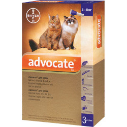 Краплі проти паразитів Байєр Адвокат для котів від 4 до 8 кгBayer Advocate (Байєр Адвокат) краплі для котів вагою до 4 кг Ціна за 1 піпетку. Застосування: Для лікування та попередження зараження блохами (Ctenocephalidesfelis), лікування алергічного блошиного дерматиту, лікування отодектозу (викликаного Otodectescynotis), профілактика дирофіляріозу (знищує мікрофілярії L 3 і L 4 Dirofilariaimmit