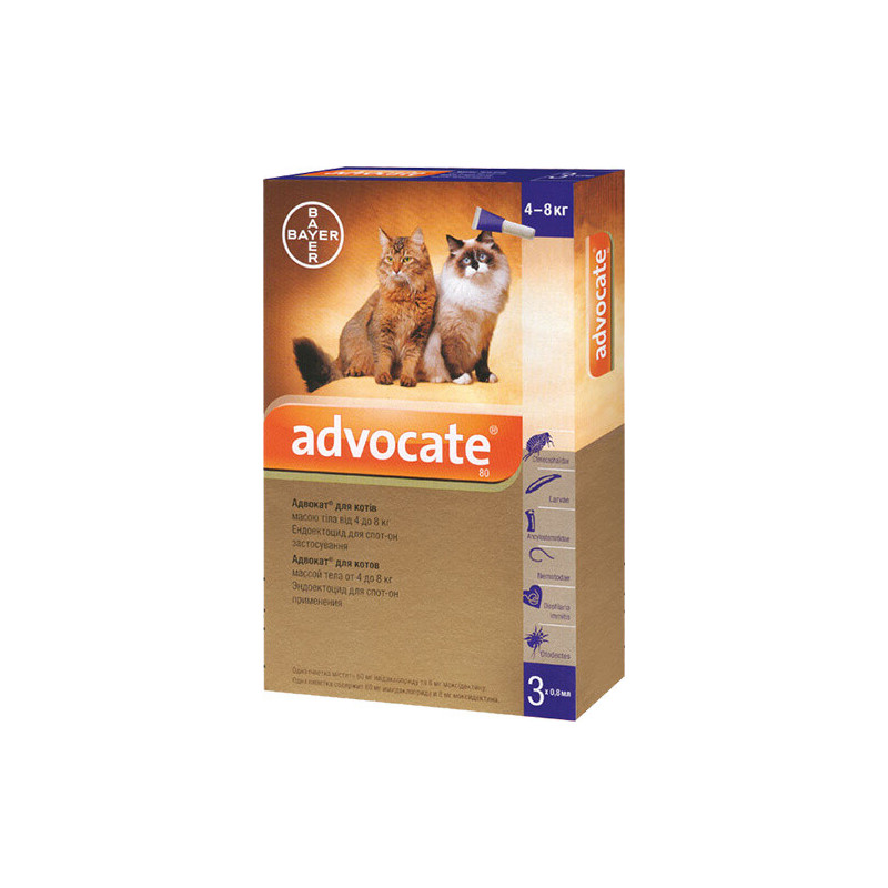 Краплі проти паразитів Байєр Адвокат для котів від 4 до 8 кгBayer Advocate (Байєр Адвокат) краплі для котів вагою до 4 кг Ціна за 1 піпетку. Застосування: Для лікування та попередження зараження блохами (Ctenocephalidesfelis), лікування алергічного блошиного дерматиту, лікування отодектозу (викликаного Otodectescynotis), профілактика дирофіляріозу (знищує мікрофілярії L 3 і L 4 Dirofilariaimmitis), лікування гастроінтестинальних нематодозів (личинки L 4, незрілі і імаго Toxocaracati, Ancylostomacati, Ancylostomatubaeforme) Дозування: Мінімальна терапевтична доза 10 мг / кг живої ваги імідаклоприд і 1,0 мг / кг ваги моксідектину, що еквівалентно 0,1 мл / кг ваги препарату Адвокат для котів Вага кішки, кг Розмір піпетки Обсяг (мл) Імідаклоприд (мг / кг ваги) Моксідектин (мг / кг ваги) & lt; 4 кг Адвокат для котів до 4 кг 0,4 Мінімум 10 Мінімум 1 & gt; 4-8 кг Адвокат для котів від 4 кг до 8 кг 0,8 10-20 1-2 & gt; 8 кг Використовувати відповідну комбінацію піпеток Лікування та попередження зараження блохами: Одноразово обробка препаратом знищує та попереджає зараження блохами протягом 4-6 недель.Целесообразно поєднати обробку тварини препаратом Адвокат з обробкою оточуючого середовища (наприклад аерозолем Больфо) При лікуванні алергічного блошиного дерматиту препарат застосовувати щомісяця. Лікування отодектозу: Рекомендована одноразова обробка.