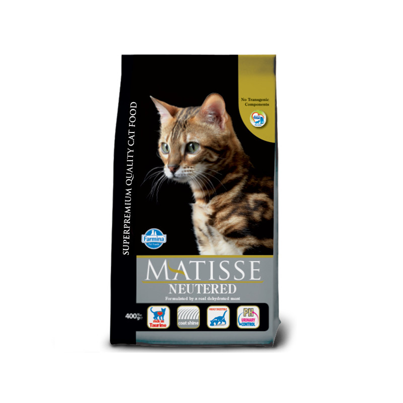 Повнораціонний та збалансований корм для дорослих стерилізованих кішок та кастрованих котів.Склад: Дегідратоване м'ясо курки та індички (32%), рис (25%), кукурудза, дегідратована риба, курячий жир, гідролізат тваринних білків, пульпа цукрових буряків, сушена морква (2%), порошок шпинату (2%), порошок пульпи червоного буряка (2%), риб'ячий жир, олія, кукурудзяний глютен, дегідратовані цілісні яйця, хлорид натрію, хлорид калію, сульфат кальцію, сухі пивні дріжджі. Добавки на 1кг: Вітамін А 16000МЕ; Вітамін D3 1600МЕ; Вітамін Е 160мг; Вітамін С 160мг; Ніацин 40мг; Пантотенова кислота 16мг; Вітамін В2 8мг; Вітамін В6 6.4мг; Вітамін В1 4.8мг; Вітамін Н 0.4мг; Фолієва кислота 0.48мг; Вітамін В12 0.06мг; Холін хлорид 2200мг; оксид цинку 108мг; сульфат цинку моногідрат 120мг; марганцю сульфат моногідрат 150мг; сульфат заліза моногідрат 44мг; заліза карбонат 60мг; сульфат міді пентагідрат 50мг; йодат безводний кальцію 2.4мг; селеніт натрію 0.22мг; DL-метіонін 3000мг.Спеціальні добавки: фарбники. Поживні речовини: сирий білок 32.00%; сирий жир та олія 11.00%; сира клітковина 1.20%; сира зола 6.60%; кальцій 1,00%; фосфор 0,90%; магній 0,08%; таурін 1800мг/кг.ЕНЕРГЕТИЧНА ЦІННІСТЬEM Kcal/Kg 3567 - Mj/Kg 14,92Рекомендації щодо використання: норми годівлі вказані в таблиці на упаковки.