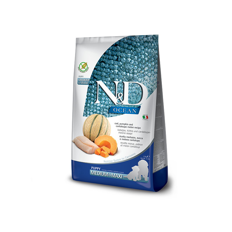 N&D Ocean для собак є повноцінним раціоном, що містить ВСІ необхідні поживні речовини для щоденного благополуччя наших чотирилапих членів сім'ї, привносить користь морепродуктів у їжу вашого вихованця.96 % білка тваринного походження, 0 % штучних консервантів, 0 % злаків, Основний інгредієнт, тріска, містить багато білка і мало жиру, що робить її відмінним джерелом білка.Тріска також багата на вітаміни та мінерали, а також джерелом жирних кислот Омега-3, які сприяють функціонуванню серцево-судинної, ендокринної та імунної систем.Гарбуз є типовим овочем італійської кухні, який має унікальні поживні та багато корисних властивостей, як-от антидіабетичні, підтримує імунну систему, активний проти вільних радикалів, що також призводить до антиканцерогенного ефекту, сприяє захисту серцево-судинної системи, регулює перистальтику кишківника, має протизапальний ефект, розчинну клітковину та антиоксиданти.Повнораціонний беззерновий сухий корм для цуценят, вагітних і годуючих сук.Склад : свіжа тріска (28%), дегідратована тріска (27%), солодка картопля, риб'ячий жир (оселедець), дегідратований оселедець, сушений гарбуз (5%), дегідратована креветка (джерело глюкозаміну та хондроїтин сульфату), волокна гороху, сушена морква, сушена люцерна, інулін, фруктоолігосахариди, дріжджовий екстракт (джерело манноолігосахаридів), сушена мускусна диня (0,5%), сушені яблука, сушений гранат, сушений шпинат, подорожник, сушена чорниця, хлорид натрію, хлорид калію, карбонат кальцію, сухі пивні дріжджі, куркуми (0,2%), екстракт алое вера. Харчові добавки на 1 кг: Вітамін А 16000МЕ; Вітамін D3 - 1600МЕ; Вітамін Е 600мг; Вітамін С 160мг; Ніацин 40мг; D-кальцію пантотенат 16мг; Вітамін В2 - 8мг; Вітамін В6 - 6,4 мг; Вітамін В1 - 4,8 мг; Біотин 0,40 мг; Фолієва кислота - 0,48 мг; Вітамін В12 - 0,1 мг; Холіну хлорид 2800 мг; Бета-каротин 1,5 мг; Цинк (Хелат цинку гідрокси-аналога метіоніну) - 163,8 мг; Марганець (Хелат марганцю гідрокси-аналога метіоніну) - 64,6 мг; Залізо (Хелат заліза гідрату гліцину) - 58,3 мг; Мідь (Хелат міді гідрокси-аналога метіоніну) - 15,8 мг; Селен (Селенізовані дріжджі інактивовані) - 0,00088 мг; DL-метіонін, технічно чистий 6000 мг; Таурин 1000 мг; L-карнітин 300 мг.