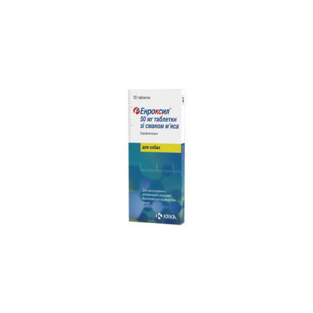 Енроксил® 50 мг таблетки зі смаком м’яса(таблетки)ОписЛедь двоопуклі таблетки зі скошеними краями та рискою на одному боці, від кремового до блідо-коричнюватого кольору з можливими білими та темними плямами. Склад1 таблетка (183 мг) препарату містить діючу речовину: енрофлоксацин – 50 мг. Допоміжні речовини: маніт, крохмаль кукурудзяний, натрію крохмальгліколят, ароматизатор м’ясний 10022, акрилатний сополімер, натріюлаурилсульфат, дибутилсебацинат, натрію кроскармелоза, кремнію діоксид колоїдний безводний, тальк, магнію стеарат.Фармакологічні властивостіATC vet класифікаційний код QJ01 - антибактеріальні ветеринарні препарати для системного застосування.