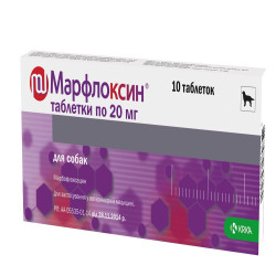 Марбофлоксацин повільно виводиться (t½ß = 14 годин у собак та 10 годин у котів), в основному, в активній формі з сечею (2/3) і фекаліями (1/3).ЗастосуванняСобаки: лікування тварин при захворюваннях органів сечовивідних шляхів та дихання, шкіри та м'яких тканин (піодермія шкірних складок, імпетиго, фолікуліт, фурункульоз, целюліт), що спричинені мікроорганізмами, чутливими до марбофлоксацину.