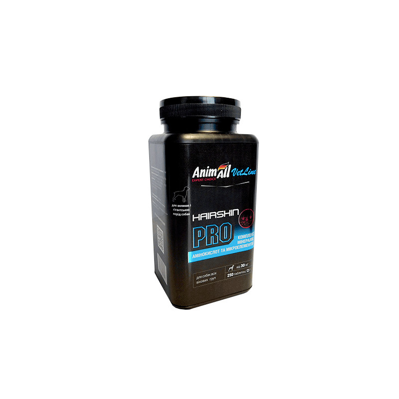 AnimAll VetLine Hair Skin PRO для великих порід собак250 таб по 2 грПрофілактика та комплексна терапія хвороб шкірного покриву (дерматити, дерматози, у тому числі алергічні)Комплекс застосовують з метою кращого засвоєння організмом незамінних амінокислот, водо- і жиророзчинних вітамінів, мікро- і макроелементів, формула містить пробіотики (група Lactobacillus, Bifidobacterium bifidum, Streptoco