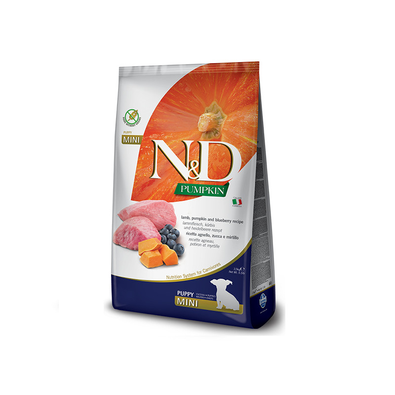 N&D GRAIN FREE PUMPKIN DOG LAMB & BLUEBERRY PUPPY MINI 2,5 kgБеззерновий сухий корм для цуценят дрібних порід (гарбуз / ягня / чорниця), 2.5 кгN & D Grain Free Pumpkin Puppy Mini Lamb and Blueberry - це повноцінний сухий корм для цуценят, вагітних і годуючих сук.