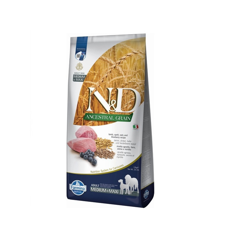 N&D LOW GRAIN DOG LAMB & BLUEBERRY ADULT MEDIUM & MAXI 12 KGНизькозерновий сухий корм для собак середніх та великих порід (ягня / чорниця), 12 кгFarmina N & D Ancestral Grain ADULT MEDIUM & MAXI Lamb and Blueberry для дорослих собак середніх і великих порід, багатий тваринним білком, фруктами, овочами, мінералами і невеликою кількістю спадкових злаків.