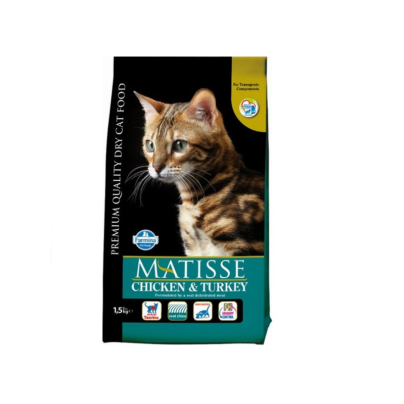 Повнораціонний та збалансований корм для дорослих кішок.Склад: Дегідратоване м'ясо курки та індички (32%), рис (25%), кукурудза, дегідратована риба, курячий жир, гідролізат тваринних білків, пульпа цукрових буряків, сушена морква (2%), порошок шпинату (2%), порошок пульпи червоного буряка (2%), риб'ячий жир, олія, кукурудзяний глютен, дегідратовані цілісні яйця, хлорид натрію, хлорид калію, сульфат кальцію, дріжджі сухі пивні.Добавки на 1кг: Вітамін А 16000МЕ; Вітамін D3 1600МЕ; Вітамін Е 160мг; Вітамін С 160мг; Ніацин 40мг; Пантотенова кислота 16мг; Вітамін В2 8мг; Вітамін В6 6.4мг; Вітамін В1 4.8мг; Вітамін Н 0.4мг; Фолієва кислота 0.48мг; Вітамін В12 0.06мг; Холін хлорид 2200мг; оксид цинку 108мг; сульфат цинку моногідрат 120мг; марганцю сульфат моногідрат 150мг; сульфат заліза моногідрат 44мг; заліза карбонат 60мг; сульфат міді пентагідрат 50мг; йодат безводний кальцію 2.4мг; селеніт натрію 0.22мг; DL-метіонін 3000мг.Спеціальні добавки: фарбники.Поживні речовини: сирий білок 32.00%; сирий жир та олія 11.00%; сира клітковина 1.20%; сира зола 6.60%; кальцій 1,00%; фосфор 0,90%; магній 0,08%; таурін 1800мг/кг.ЕНЕРГЕТИЧНА ЦІННІСТЬEM Kcal/Kg 3567 - Mj/Kg 14,92Рекомендації щодо використання: норми годівлі вказані в таблиці на упаковки.