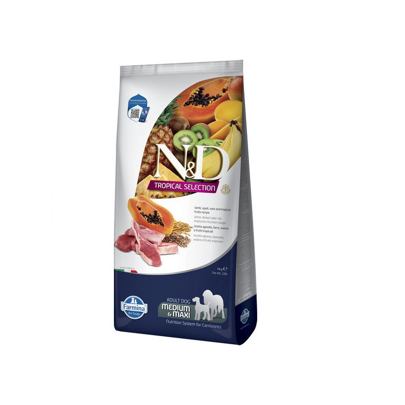 • Сухий низькозерновий корм Farmina N&D TROPICAL SELECTION для дорослих собак середніх і великих порід з ягням і тропічними фрукта