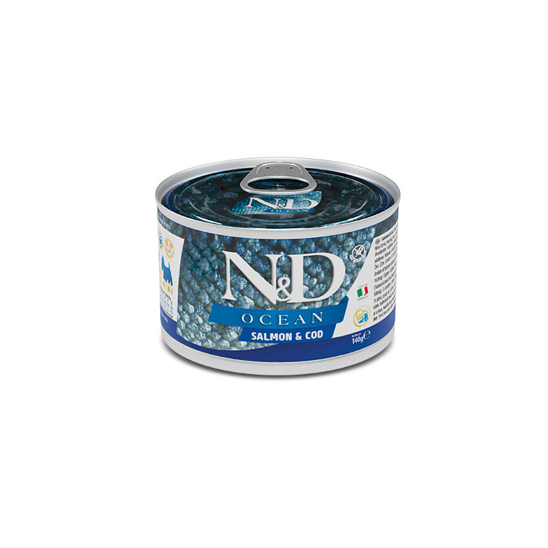 Вологий корм Salmon & Cod Adult MiniСклад: філе лосося (30%), філе тріски (30%), оселедець, тунець, батат, риб'ячий жир, тваринний жир, креветки, фруктоолігосахариди, хондроїтин сульфат, глюкозамін, вітаміни, мінерали.Харчові добавки на кг: Вітамін A 4000IU; Вітамін D3 400IU; Вітамін E 130мг; Холін хлорид 400мг; Цинк (хелат цинку гідрокси аналога метіоніну): 36мг; Марганець (хелат марганцю гідрокси аналога метіоніну): 6. 8 мг; Залізо (залізо(II) хелат гліцин гідрату): 16,8 мг; Мідь (мідь хелат гідрокси аналога метіоніну): 2,9 мг; Селен (селен інактивовані дріжджі): 0,00242 мг; DL-метіонін, технічно чистий 1000 мг; Таурин 500 мг; L-карнітин 50 мг.ПОЖИВНІ РЕЧОВИНИ: волога 76,00%; сирий протеїн 11,00%; сирий жир 2,80%; сира клітковина 0,50%; сира зола 2,70%.ЕНЕРГЕТИЧНА ЦІННІСТЬЕМ Ккал/кг 942 - Мдж/кг 3,94