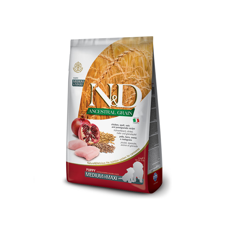 N&D LOW GRAIN DOG CHICKEN & POMEGRANATE PUPPY MEDIUM & MAXI 2,5 KGНизькозерновий сухий корм для цуценят средніхі та великих порід (курка/гранат), 2,5 кгFarmina N & D Low Grain Puppy Medium & Maxi Chicken and Pomegranate - це повноцінний корм для цуценят і сук, які вагітні або годують грудьми.