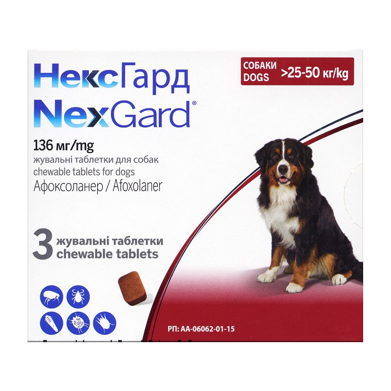 Boehringer Ingelheim НексГард - інсекто-акарицидний засіб у вигляді таблеток для жування, що застосовуються для профілактики та лікування собак масою тіла 25-50 кг при ураженнях ектопаразитами, а також для профілактики ураження кліщами. Призначення: Профілактика та лікування собак при ураженнях кліщами (Dermacentor variabilis, D. reticulatus, Ixodes ricinus, I. scapularis, I. hexagonus, Rhipicephalus sanguineus, Amblyomma americanum та Haemaphysalis longicornis) та блохами (Ctenocephalides felis та C. canis). Препарат можуть застосовувати, як один із засобів, при лікуванні блошиного алергічного дерматиту собак:o Лікування демодекозу (спричиненого Demodex canis).o Лікування саркоптозу (спричиненого Sarcoptes scabiei var. canis).o Лікування отодектозу (спричиненого Otodectes cynotis). Механізм дії:Афоксоланер належить до сполук ізоксазолінового класу, його дія полягає в блокуванні ГАМК-залежних рецепторів паразитів, порушенні передачі нервових імпульсів, що призводить до ураження нервової системи ектопаразитів і їх загибелі.