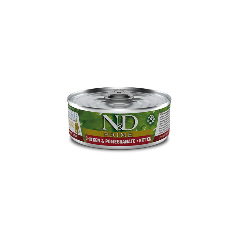 Farmina є піонером ринку консервованих вологих продуктів, застосовуючи технологію Multifiller, яка дозволяє дуже точно дозувати у банку кожен окремий інгредієнт за допомогою спеціальних дозаторів.Ця технологія дозволяє калібрувати шматки м'яса та розмір скибочок риби, щоб мати шматки потрібного виду та розміру.Процес повільного приготування на пару із сучасною стерилізацією їжі дозволяє зберегти органолептичні характеристики інгредієнтів.Щоб захистити благополуччя вашого вихованця та забезпечити принцип натуральності продуктів N&D, банки не містять BPA.У вологих кормах Farmina N&D Prime, Pumpkin та Ancestral немає карагінанів та інших загусників, завдяки ексклюзивній виробничій системі.Всі вологі корми N&D не містять злаків або містять невелику кількість неселекціонованих злаків, які забезпечують поступове надходження енергії в організмі.Технології Farmina дозволяють виробляти мікробіологічно стерилізовані корми, які не потребують будь-яких консервантів.Завдяки нижчому вмісту вологи, вологі корми N&D мають більш високий рівень сухої речовини!Усі корми Farmina – це результат наукових досліджень, спрямованих на благополуччя тварин.Склад: М'ясо курки (50%), оселедець, варені курячі яйця, солодка картопля, риб'ячий жир, гранат (2%), фруктоолігосахариди, холіну хлорид, сульфат хондроїтину, глюкозамін, вітаміни, мінерали.ХАРЧОВІ ДОБАВКИ НА КГВітамін А – 5600 МО; Вітамін D3 – 370 МО; Вітамін Е – 185 мг; Холін хлорид – 584 мг; Хелат цинку аналогічний метіонін гідроксилазі – 230 мг; Хелат марганцю аналогічний метіонін гідроксилазі – 46 мг; Хелат заліза гідрату гліцину – 84 мг; Хелат міді аналогічний метіонін гідроксилазі – 18,5 мг; DL-метіонін – 1750 мг; Таурін – 935 мг; L-карнітин – 58 мг.ПОЖИВНІ РЕЧОВИНИволога – 75,00%; сирий білок – 13,50%; сирий жир та олії - 5,50%; сира клітковина – 0,40%; сира зола – 2,90%.ЕНЕРГЕТИЧНА ЦІННІСТЬEM Kcal/Kg 1115 - Mj/Kg 4,66