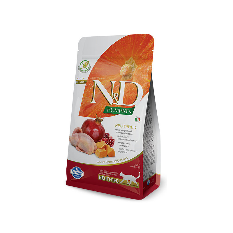 Корм для кастрованих кішок Farmina N&D Cat Pumpkin Quail & Pomegranate має беззернову формулу, що не містить ГМО і штучних консервантів.Склад: свіже м'ясо перепілки (32%), дегідратоване м'ясо перепілки (30%), гороховий крохмаль, дегідратований гарбуз (5%), дегідратовані цільні яйця, курячий жир, свіжий оселедець, дегідратований оселедець, гідролізат рибного білка, риб'ячий жир, сушена морква, сушена люцерна, інулін, фруктоолігосахариди, маннанолігосахариди (дріжджовий екстракт), сушений гранат (0,5%), сушені яблука, сушений шпинат, подорожник (0,3%), сушена чорна смородина, дегідратований солодкий апельсин, сушена чорниця, хлорид натрію, сухі пивні дріжджі, куркума (0,2%), глюкозамін, хондроїтин сульфат, екстракт календули (джерело лютеїну).Харчові добавки на кг: Вітамін А - 18000МЕ; Вітамін D3 - 1200МЕ; Вітамін Е - 600мг, вітамін С - 300мг; Нікотинова кислота - 150мг; Пантотенова кислота - 50 мг; Вітамін В2 - 20мг; Вітамін В6 - 8,1мг; Вітамін В1 - 10мг; Вітамін Н - 1,5мг; Фолієва кислота - 1,5 мг; Вітамін В12 - 0,1мг; Холіну хлорид - 2800мг; Бета-каротин - 1,5 мг; Хелат цинку аналогічний метіонін гідроксилази - 910мг; Хелат марганцю аналогічний метіонін гідроксилази - 380мг; Хелат заліза гідрату гліцину - 250мг; Хелат міді аналогічний метіонін гідроксилази - 88мг; Збагачені селеном інактивовані дріжджі - 0,40мг; DL-метіонін - 5000мг; Таурин - 4000мг.