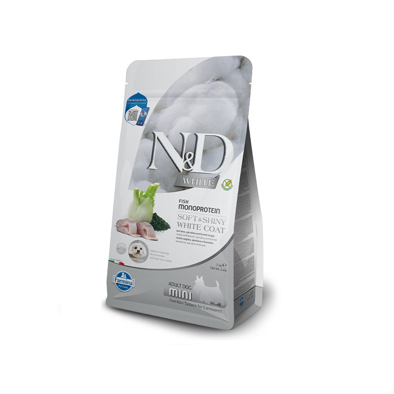 Рецепт із сібасом, спіруліною та фенхелем допомагає зменшити утворення плям.Метою Farmina N&D WHITE SOFT&SHINY COAT є забезпечення належної поживної підтримки для бездоганної шерсті!Склад: сібас (20%), дегідратований білок сібаса (20%), солодка картопля, риб'ячий жир (з оселедця), гідролізований рибний білок, сушена спіруліна (5%), насіння льону, сушений фенхель (2,5%), клітковина гороху, шрот люцерни, інулін, фруктоолігосахариди, екстракт дріжджів (джерело манноолігосахаридів), сушений шпинат, лушпиння та насіння псиліума, сухі пивні дріжджі, дикальцію фосфат, калію хлорид, натрію хлорид, екстракт алое вера, глюкозамін, хондроїтин сульфат.Харчові добавки на кг: Вітамін А 15000 МО; Вітамін D3 1500 МО; Вітамін Е 600 мг; Вітамін С 150 мг; Ніацин 37,5 мг; кальцію D-пантотенат 15 мг; вітамін B2 7,5 мг; вітамін B6 6 мг; Вітамін В1 4,5 мг; біотин 0,38 мг; фолієва кислота 0,45 мг; вітамін В12 0,1 мг; холін хлорид 2500мг; бета-каротин 1,5 мг; цинк (хелат цинку гідрокси-аналога метіоніну): 163.8mg; Марганець (хелат марганцю гідрокси-аналогу метіоніну): 163.8mg; Марганець (хелат марганцю гідрокси-аналога метіоніну): 64.6 мг; Залізо (заліза (II) хелат гліцин гідрату): 58.3 мг; Мідь (мідний хелат гідрокси-аналога метіоніну): 4 мг; Селен (Селенізовані дріжджі інактивовані): 0,14960 мг; Йод (кальцію йодат безводний): 1,56 мг; DL-метіонін, технічно чистий 4000 мг; таурин 1000 мг; L-карнітин 300 мг.