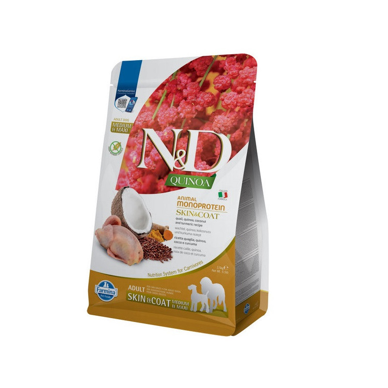 FARMINA N&D DOG Grain Free Quinoa Skin & Coat ADULT MINI QUAIL – беззерновий сухий корм для дорослих соба середніх та великих порід порід схильних до захворювань шкіри і шерсті, з перепелом, кокосом і куркумою.N&D Quinoa – це інноваційна лінійка функціональних кормів, призначених для підтримки здоров’я кішок з особливими потребами в харчуванні.