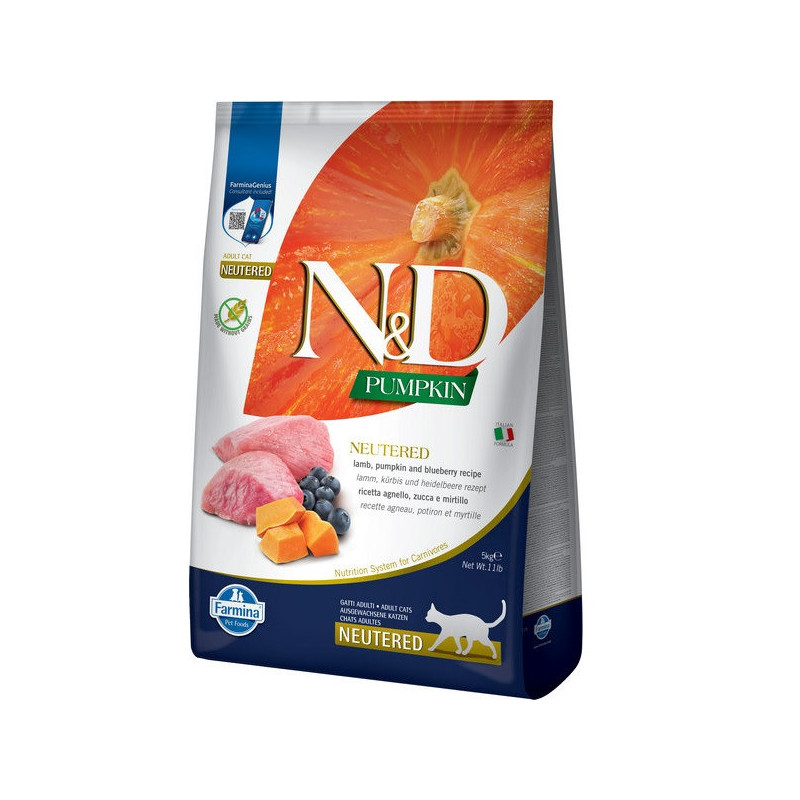 FARMINA N&D Grain Free Pumpkin, Lamb & Blueberry Neutered – повнораціонний беззерновий корм для дорослих стерилізованих кішок і кастрованих котів з гарбузом, ягням та чорницями.М’ясо ягняти по праву вважається самим дієтичним м’ясним продуктом.