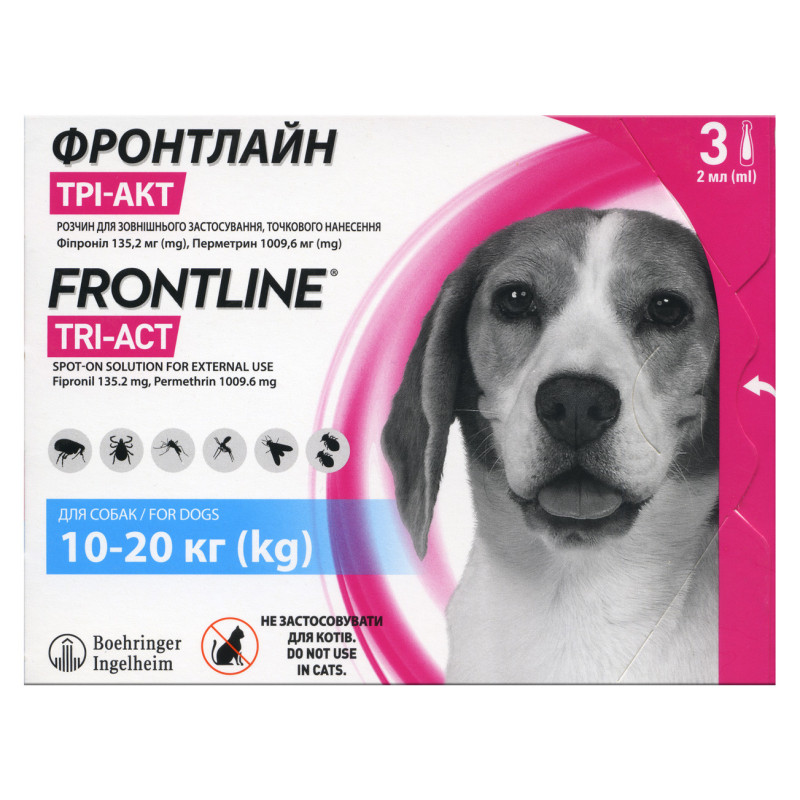 Краплі Boehringer Ingelheim Frontline TRI-AKT (M) 10-20 кг проти бліх, кліщів, комарів, москітів, мух для собак Boehringer Ingelheim Frontline TRI-AKT (Берінгер Інгельхайм Фронтлайн Трі-Акт) лікування та профілактика ектопаразитарних захворювань у собак. Препарат забезпечує інсектицидну і репелентну дію проти москітів, комарів, кліщів і мух-жигалок, таким чином знижуючи ризик передачі трансміси