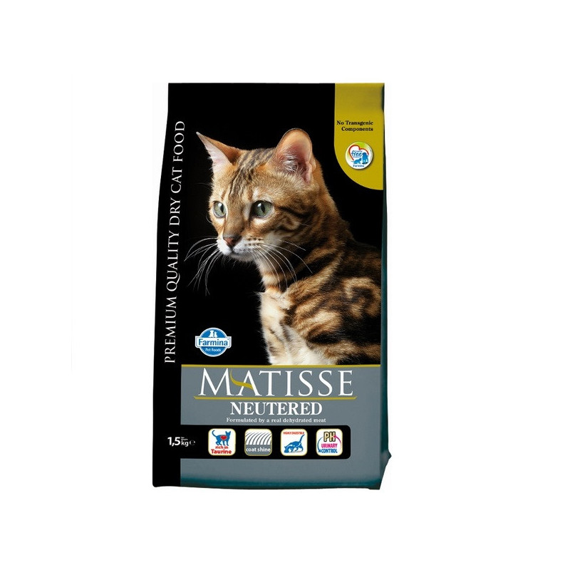 Повнораціонний та збалансований корм для дорослих стерилізованих кішок та кастрованих котів.Склад: Дегідратоване м'ясо курки та індички (32%), рис (25%), кукурудза, дегідратована риба, курячий жир, гідролізат тваринних білків, пульпа цукрових буряків, сушена морква (2%), порошок шпинату (2%), порошок пульпи червоного буряка (2%), риб'ячий жир, олія, кукурудзяний глютен, дегідратовані цілісні яйця, хлорид натрію, хлорид калію, сульфат кальцію, сухі пивні дріжджі. Добавки на 1кг – Вітамін А 16000МЕ; Вітамін D3 1600МЕ; Вітамін Е 160мг; Вітамін С 160мг; Ніацин 40мг; Пантотенова кислота 16мг; Вітамін В2 8мг; Вітамін В6 6.4мг; Вітамін В1 4.8мг; Вітамін Н 0.4мг; Фолієва кислота 0.48мг; Вітамін В12 0.06мг; Холін хлорид 2200мг; оксид цинку 108мг; сульфат цинку моногідрат 120мг; марганцю сульфат моногідрат 150мг; сульфат заліза моногідрат 44мг; заліза карбонат 60мг; сульфат міді пентагідрат 50мг; йодат безводний кальцію 2.4мг; селеніт натрію 0.22мг; DL-метіонін 3000мг.Спеціальні добавки: фарбники. Поживні речовини: сирий білок 32.00%; сирий жир та олія 11.00%; сира клітковина 1.20%; сира зола 6.60%; кальцій 1,00%; фосфор 0,90%; магній 0,08%; таурін 1800мг/кг.ЕНЕРГЕТИЧНА ЦІННІСТЬEM Kcal/Kg 3567 - Mj/Kg 14,92Рекомендації щодо використання: норми годівлі вказані в таблиці на упаковки.