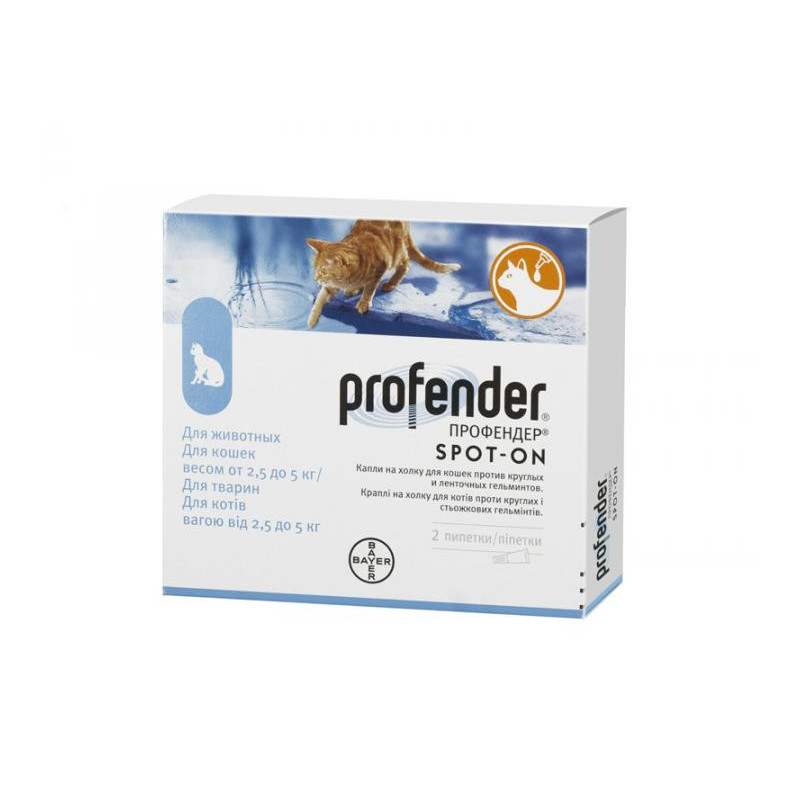 Виробник компанія & laquo; Байєр & raquo; (Німеччина). Показання Профендер призначають для дегельмінтизації котів з профілактичною і лікувальною метою при нематодозах (Тохосаra саti, Toxascaris leonine, Ancylostoma tubaeforme) і цестодозах (Echinococcus multilocularis, Dipylidium caninum, Taenia taeniaeformis). Застосування Препарат застосовують зовнішньо, наносячи в місця, недоступні для злизування, безпосередньо на шкіру між лопатками біля основи шиї.