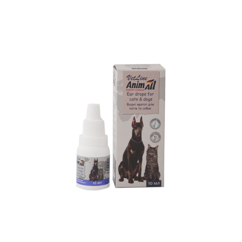 Вушні краплі AnimAll VetLine для котів і собак, 10 мл Засіб косметично-гігієнічний рідке для догляду за вухами тварин Склад 1 мл препарату містить: діюча речовина: поліміксин B - 10000 МО, неоміцину сульфат - 5000 МО, лідокаїну гідрохлориду - 40,0 мг, сульфируют - 50,0 мг, екстракт календули - 10,0 мг, екстракт ромашки - 10,0 мг, екстракт очанки - 10,0 мг.