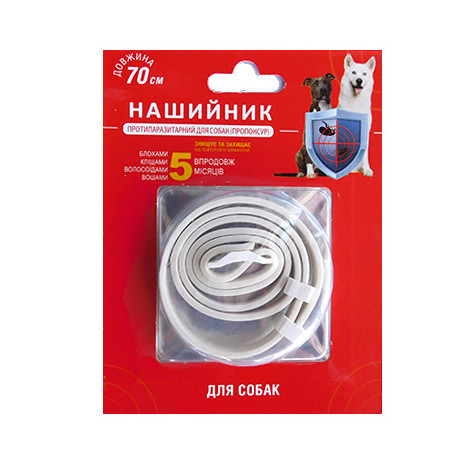 Нашийник протипаразитарний для собак , 70 см, білого кольору(10 г полімерної стрічки містить діючу речовину - пропоксур – 0,83 г)ЗастосуванняПрофілактика і лікування собак та котів, при ураженні ектопаразитами: - блохами (Ctenocephalides spp., Pulex irritans), - волосоїдами (Trichodectes canis, Felicola subrоstratus),- вошами (Linognathus setosus),- паразитиформними кліщами (Ixodes spp., Dermacentor spp., Rhipicephalus spp.), на імагінальній та личинковій стадіях розвитку.ВикористанняНашийник виймають із упакування та одівають на шию тварини, фіксуючи таким чином, щоб між шиєю та нашийником залишався невеликий проміжок у 1,0-1,5 см, закріплюють фіксатором та обрізають надлишок стрічки.