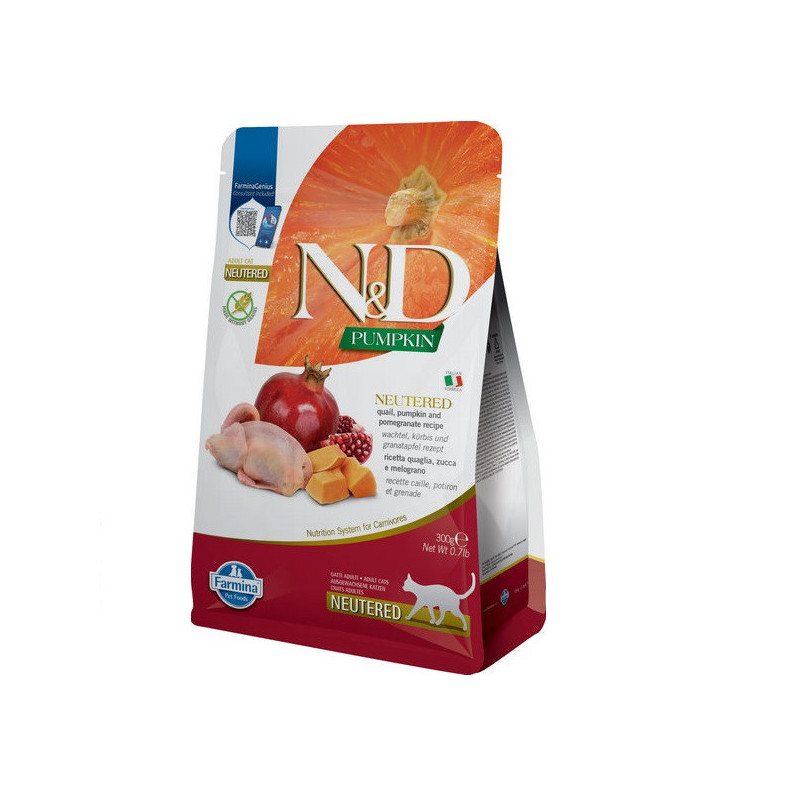 Корм для кастрованих кішок Farmina N&D Cat Pumpkin Quail & Pomegranate має беззернову формулу, що не містить ГМО і штучних консервантів.Склад:  свіже м'ясо перепілки (32%), дегідратоване м'ясо перепілки (30%), гороховий крохмаль, дегідратований гарбуз (5%), дегідратовані цільні яйця, курячий жир, свіжий оселедець, дегідратований оселедець, гідролізат рибного білка, риб'ячий жир, сушена морква, сушена люцерна, інулін, фруктоолігосахариди, маннанолігосахариди (дріжджовий екстракт), сушений гранат (0,5%), сушені яблука, сушений шпинат, подорожник (0,3%), сушена чорна смородина, дегідратований солодкий апельсин, сушена чорниця, хлорид натрію, сухі пивні дріжджі, куркума (0,2%), глюкозамін, хондроїтин сульфат, екстракт календули (джерело лютеїну).Харчові добавки на кг: Вітамін А - 18000МЕ; Вітамін D3 - 1200МЕ; Вітамін Е - 600мг, вітамін С - 300мг; Нікотинова кислота - 150мг; Пантотенова кислота - 50 мг; Вітамін В2 - 20мг; Вітамін В6 - 8,1мг; Вітамін В1 - 10мг; Вітамін Н - 1,5мг; Фолієва кислота - 1,5 мг; Вітамін В12 - 0,1мг; Холіну хлорид - 2800мг; Бета-каротин - 1,5 мг; Хелат цинку аналогічний метіонін гідроксилази - 910мг; Хелат марганцю аналогічний метіонін гідроксилази - 380мг; Хелат заліза гідрату гліцину - 250мг; Хелат міді аналогічний метіонін гідроксилази - 88мг; Збагачені селеном інактивовані дріжджі - 0,40мг; DL-метіонін - 5000мг; Таурин - 4000мг.