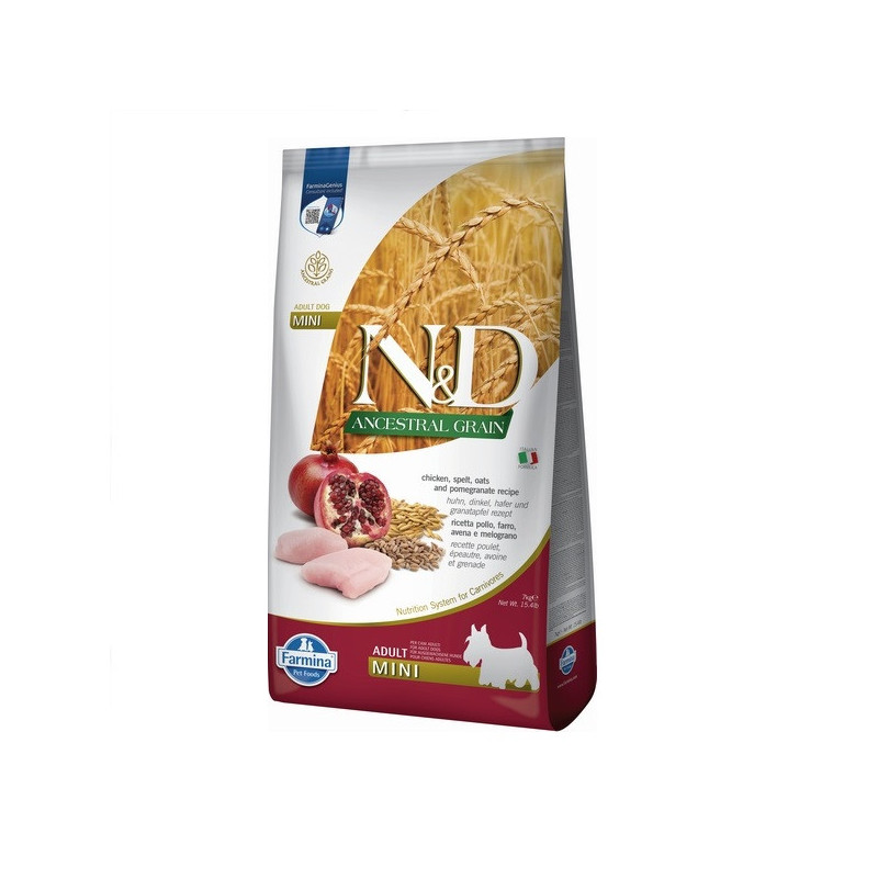 N&D LOW GRAIN DOG CHICKEN & POMEGRANATE ADULT MINI 7 kgНизькозерновий сухий корм для собак дрібних порід (курка / гранат), 7 кгFarmina N & D Low Grain CHICKEN & POMEGRANATE Adult Mini - це повноцінний сухий корм для дорослих собак невеликих розмірів.