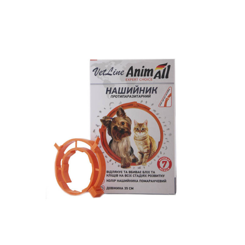 Нашийник протипаразитарний Анімалл ВетЛайн для котів і собак, помаранчевий, 35 см Склад Один нашийник містить діючі речовини: Імідаклоприд - 10%, флуметрин - 4,5%.