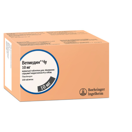 Ветмедин® Чу 10 мг жувальні таблетки для лікування серцевої недостатності у собак (таблетки) Опис Коричнева, овальна жувальна таблетка, що ділиться та має лінію розлому з обох боків.