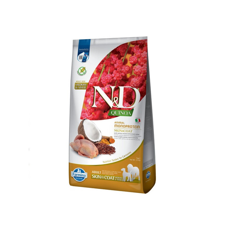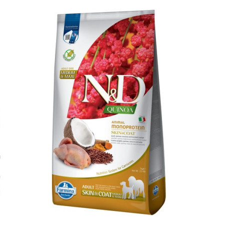 FARMINA N&D DOG Grain Free Quinoa Skin & Coat ADULT MINI QUAIL – беззерновий сухий корм для дорослих соба середніх та великих порід порід схильних до захворювань шкіри і шерсті, з перепелом, кокосом і куркумою.N&D Quinoa – це інноваційна лінійка функціональних кормів, призначених для підтримки здоров’я кішок з особливими потребами в харчуванні.