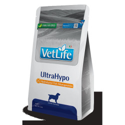 Farmina Vet Life UltraHypo це повноцінне дієтичне харчування для собак для зменшення непереносимості інгредієнтів та поживних речовин; елімінаційна дієта; для підтримки функції шкіри у разі дерматозу та надмірної втрати шерсті.Склад: рисовий крохмаль, гідролізований рибний білок, риб’ячий жир, хлорид калію, карбонат кальцію, монодикальційфосфат, хлористий натрій.