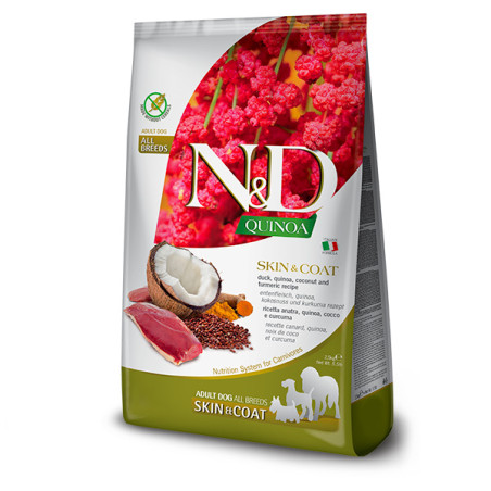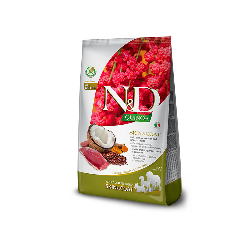 N&D Quinoa Skin & Coat - Coat - повнораціонний дієтичний сухий корм для дорослих собак, рекомендований у разі харчової непереносимості.Свіже м'ясо качки без кісток (20%), дегідратований білок качки (20%), гороховий крохмаль, риб'ячий жир (оселедець), кіноа (8%), насіння льону, сушений кокос (2,5%), куркума (2,5%), інулін, фруктоолігосахариди, дріжджовий екстракт (джерело манноолігосахаридів), карбонат кальцію, дикальцій фосфат, лушпиння насіння подорожника, калію хлорид, натрію хлорид, сухі пивні дріжджі, екстракт алое вера, глюкозамін, хондроїтин сульфат.