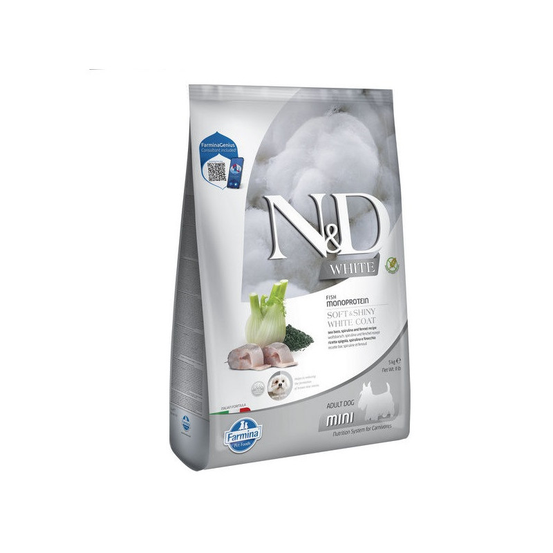 Рецепт із сібасом, спіруліною та фенхелем допомагає зменшити утворення плям.Метою Farmina N&D WHITE SOFT&SHINY COAT є забезпечення належної поживної підтримки для бездоганної шерсті!Склад: сібас (20%), дегідратований білок сібаса (20%), солодка картопля, риб'ячий жир (з оселедця), гідролізований рибний білок, сушена спіруліна (5%), насіння льону, сушений фенхель (2,5%), клітковина гороху, шрот люцерни, інулін, фруктоолігосахариди, екстракт дріжджів (джерело манноолігосахаридів), сушений шпинат, лушпиння та насіння псиліума, сухі пивні дріжджі, дикальцію фосфат, калію хлорид, натрію хлорид, екстракт алое вера, глюкозамін, хондроїтин сульфат.Харчові добавки на кг: Вітамін А 15000 МО; Вітамін D3 1500 МО; Вітамін Е 600 мг; Вітамін С 150 мг; Ніацин 37,5 мг; кальцію D-пантотенат 15 мг; вітамін B2 7,5 мг; вітамін B6 6 мг; Вітамін В1 4,5 мг; біотин 0,38 мг; фолієва кислота 0,45 мг; вітамін В12 0,1 мг; холін хлорид 2500мг; бета-каротин 1,5 мг; цинк (хелат цинку гідрокси-аналога метіоніну): 163.8mg; Марганець (хелат марганцю гідрокси-аналогу метіоніну): 163.8mg; Марганець (хелат марганцю гідрокси-аналога метіоніну): 64.6 мг; Залізо (заліза (II) хелат гліцин гідрату): 58.3 мг; Мідь (мідний хелат гідрокси-аналога метіоніну): 4 мг; Селен (Селенізовані дріжджі інактивовані): 0,14960 мг; Йод (кальцію йодат безводний): 1,56 мг; DL-метіонін, технічно чистий 4000 мг; таурин 1000 мг; L-карнітин 300 мг.