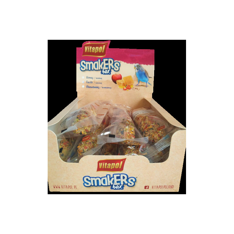 Колба Vitapol Smakers Box для папугай, зі смаком фруктів, упаковка 12 шт Ласощі Smakers складаються з трьох шарів з'єднаних так, щоб мінімізувати втрати корму під час поїдання.