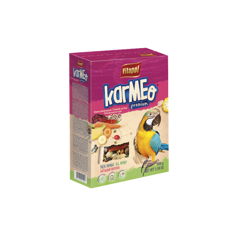 Повнораціонний корм Vitapol Karmeo Premium для великих папуг, 900 гVitapol Karmeo Premium для великих папуг– це повнораціонний корм, яка також містить усі необхідні інгредієнти, які підтримують здоров'я та правильне функціонування організму птахів. Складається з різноманітного асортименту насіння та злаків з додаванням ласощів для папуг: гарбузове насіння, шипшина, сушений перець чилі, які є де