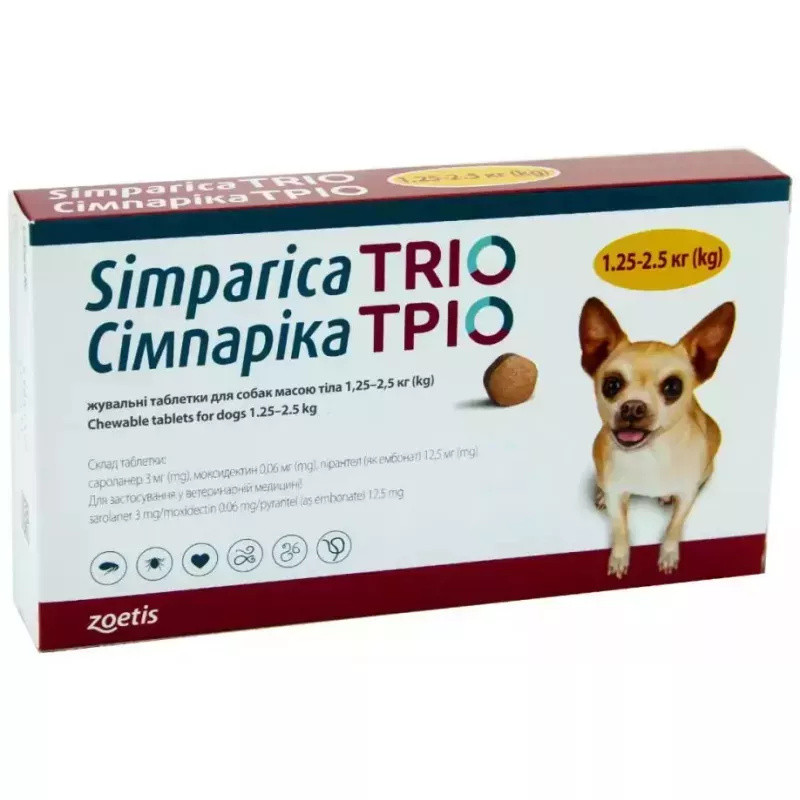 Ваша собака заслуговує на найкращий захист від паразитів, і Simparica Trio пропонує саме це. Ця унікальна жувальна таблетка не лише забезпечує тривалу дію проти бліх та кліщів, але й допомагає в боротьбі з гельмінтами, забезпечуючи комплексний захист вашому чотирилапому другу.